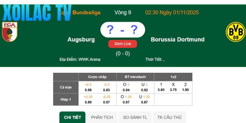 Bảng tỷ lệ kèo trận Augsburg – Borussia Dortmund